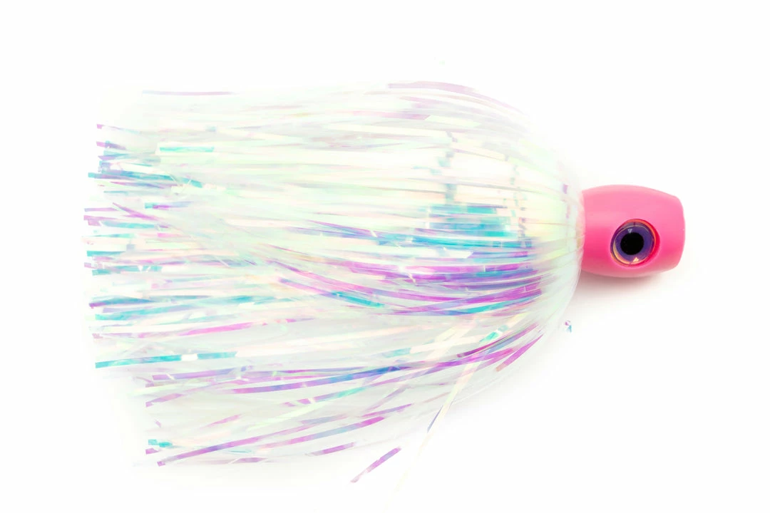 Chugger Head style lure tied with wide cut soft reversing “Bling”. Works great with or without bait. Most commonly, these lures are trolled with ballyhoo. 6” total length.