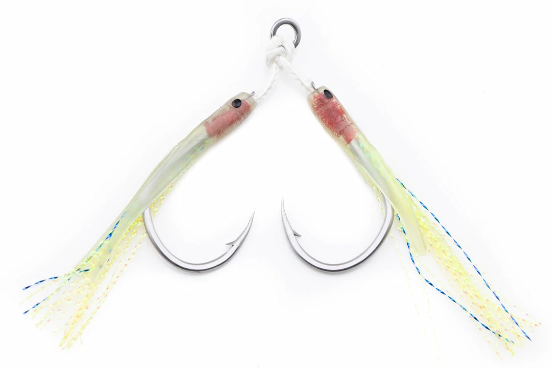 These “sabiki” style dual assist hooks from Centaur are an excellent choice for all vertical light jigging applications. The skirt is constructed from flash material with a glow in the dark rubber skirt. These hooks are stainless steel, extremely sharp, and highly corrosion resistant. We recommend these hooks for black sea bass, snappers, striped bass, groupers, and smaller trevally species.