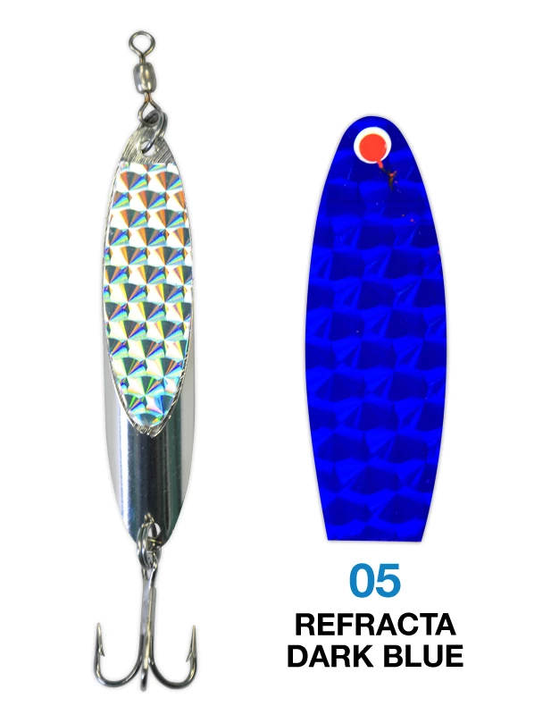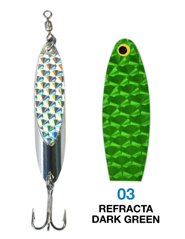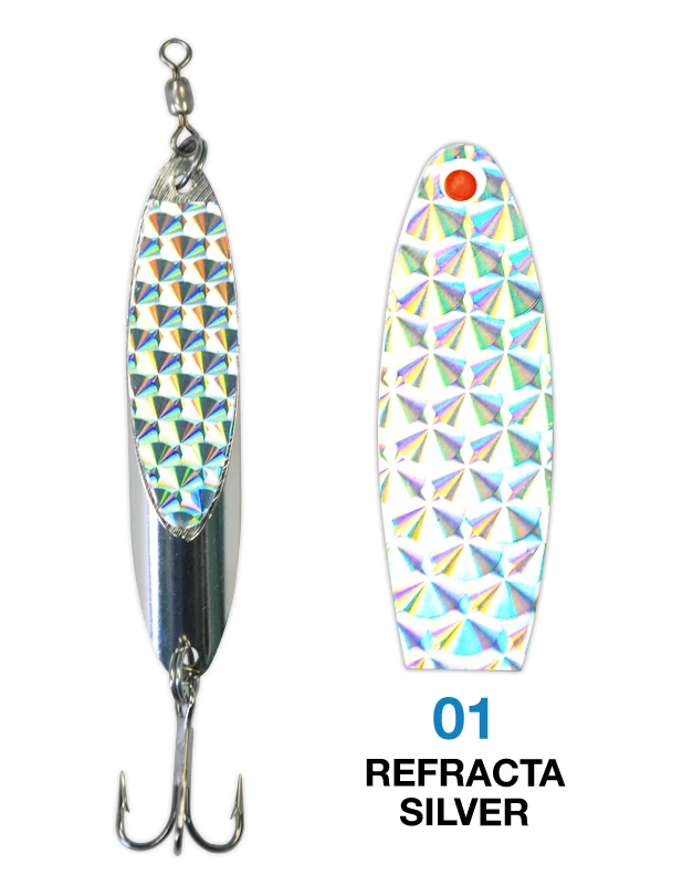 These lures have an unbeatable action when retrieved at a slow to medium speed. They come in 8 different sizes ranging from 1/16 oz. to 3 oz. and will entice a wide varity of fish. From small trout in lakes and streams to large coho (silvers) casting from shore and even huge tuna in open water, these lures will do the job. Standard Deadly Dick lures are also very popular for ice fishing perch & walleye. What ever species you are targeting, there is a size & colour combination that will be irresistable. The hand painted eye on every lure makes them look alive and the action makes them appear crippled.