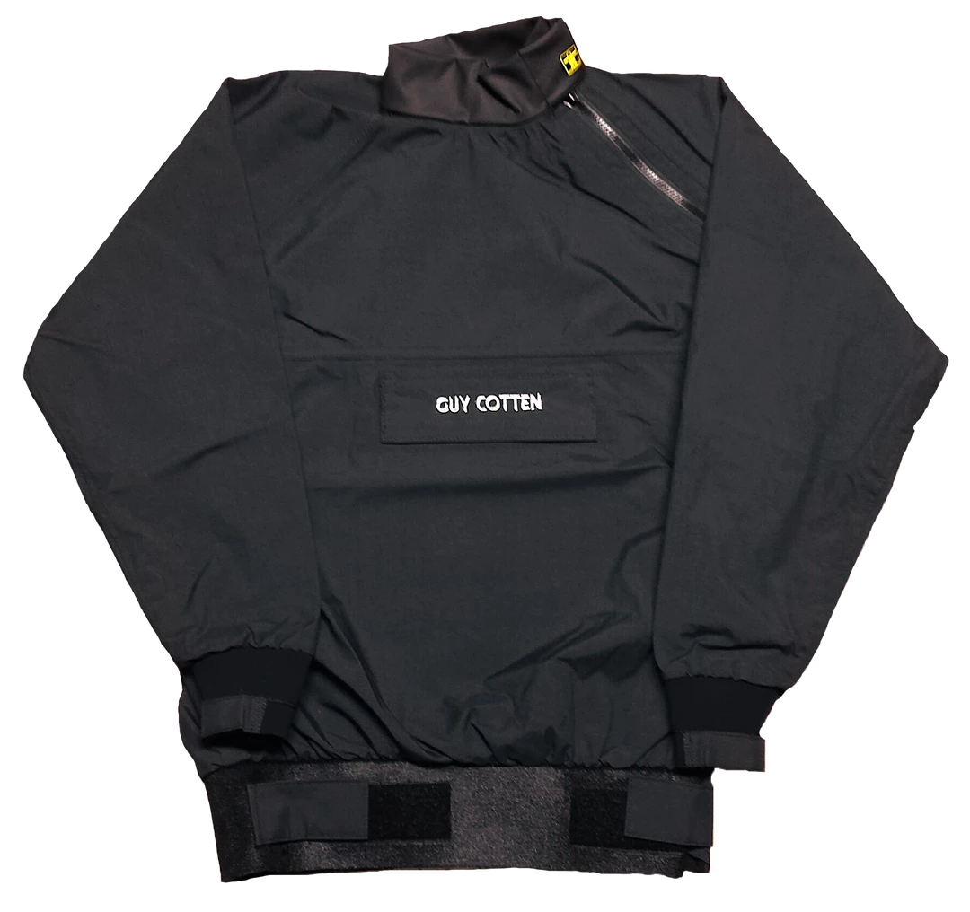 ▪ OTHER POINTS – The Waist has a secure sealing gusseted neoprene waist band with two velcro adjustments straps. The neo/velco waist closure seals the Splash top on waders or a wetsuit. The Kangaroo pouch on the front offers easy to access and convenient storage. It has a fold style flap closure (“Guy Cotten” embroidery) with velco to keep out water. The Upper Back has a loop hook with (“Guy Cotten” embroidery) to easily hang dry. The Arms and Arm Pit have a unique fabric cut to best contour the curves and allow for arm freedom and ultimate comfort while less bulk.