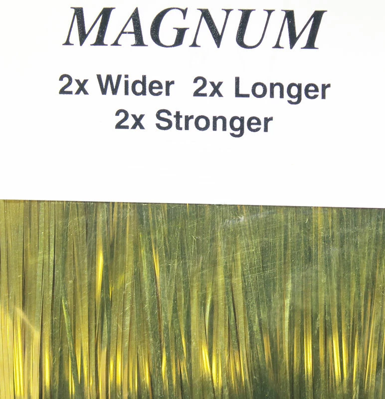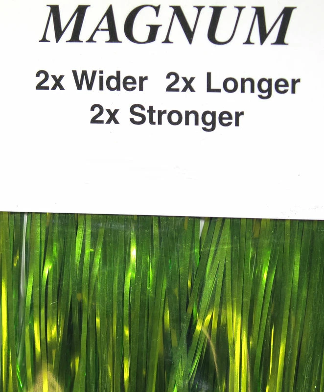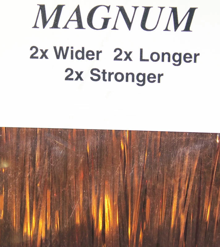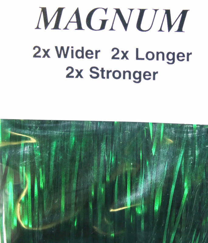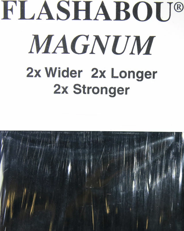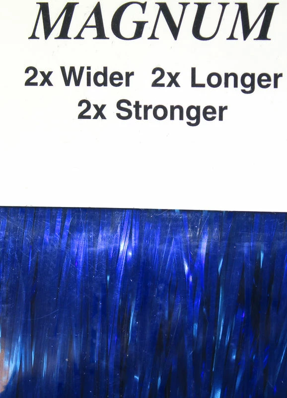 Magnum flashabou is just like regular flashabou, but in a wider and stronger cut. Twice as long, twice as wide! We really like this flashabou for custom skirting big game lures. Both marlin lures, and bullet style tuna lures look amazing when skirted with flashabou. These packages contain approximately 400 strands, 1/32″ wide by 20″ long.