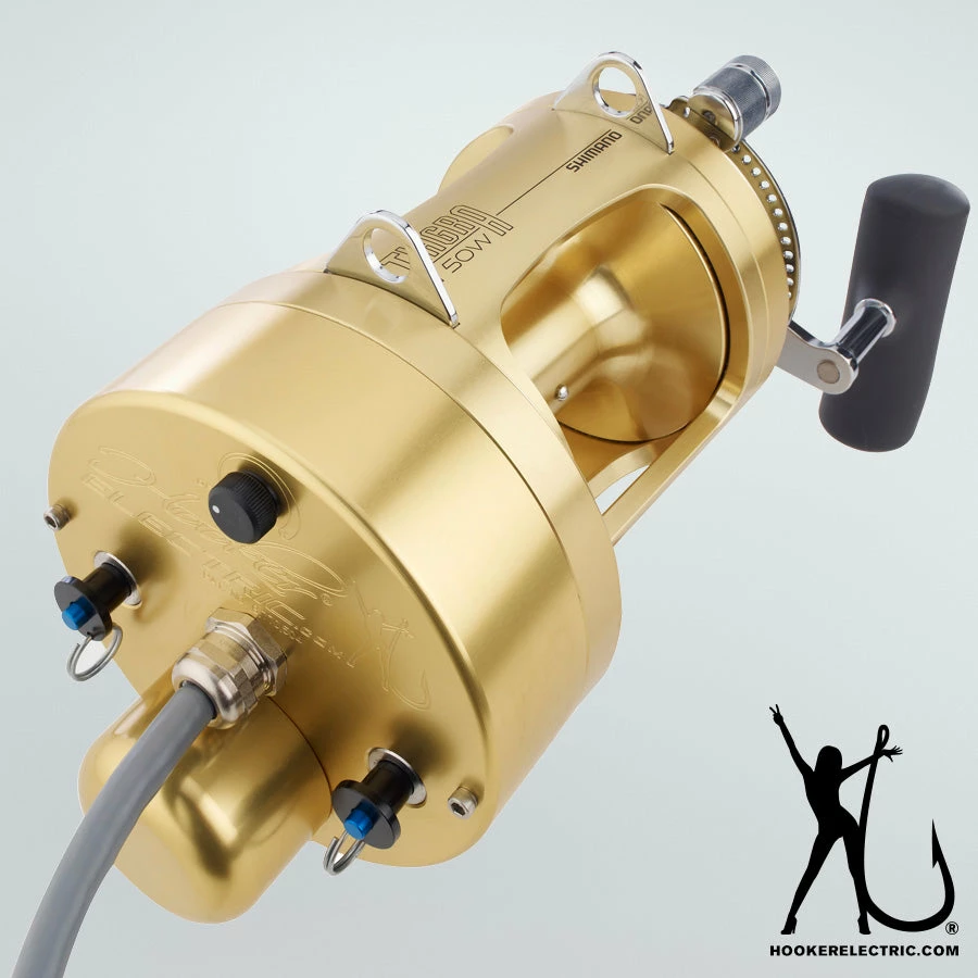 The Hooker Electric Shimano Tiagra® Detachable electric reels are truly one-of-a-kind. This detachable reel has all the capabilities of our standard electric reels, plus the option of a full manual reel. The Shimano Tiagra® Detachable Reel has the ability to remove the electric attachment off the side of the reel with a press of a button and all you’re left with is the reel in hi-gear. This option allows the angler to fight the fish manually or electrically on the fly. Another great feature this reel offers is the ability to add additional side plates to other reels and use the same electric attachment to operate the reel electrically.