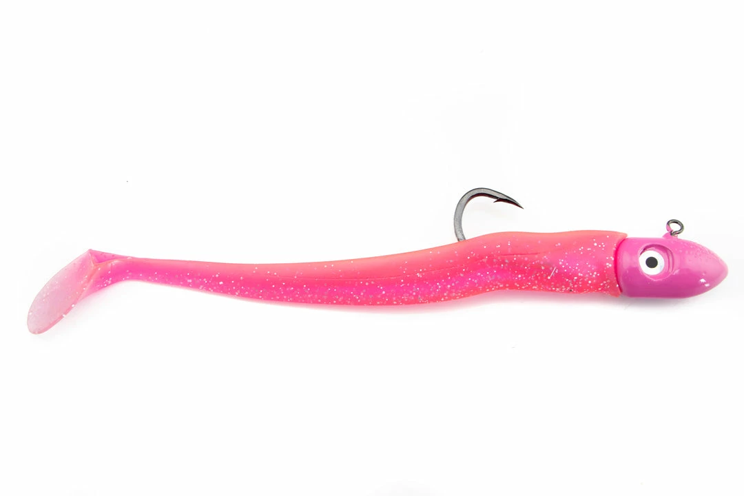 JoeBaggs Tuna Patriot soft plastics are rigged ready for big fish. This style of jig features a swing hook, and an eye formed from a swivel to assure a strong connection to fish on high drag pressures. The paddle tail style on this jig gives a built in swimming action not seen in many other lures of this style. These work great as both a casting lure, and a jigging lure depending on how you present it.
