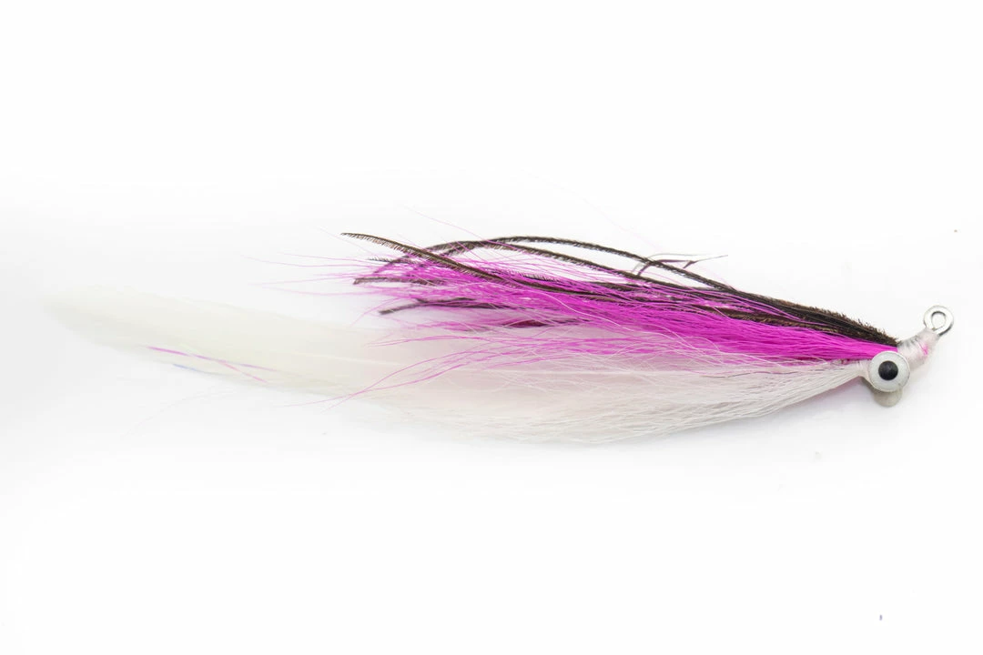 Tied by Mike “LI Flies” Ozkaya, right here on Long Island, NY. This is a variant of the classic Clouser Minnow. It is basically a Clouser, with a saddle hackle tail tied in to give the fly a little bit of extra length and profile. Works well for striped bass, bluefish, redfish, snook, and many other species. These flies feature weighted dumbell eyes, to help get the fly down a little deeper in the water column, and they are tied on a jig hook.