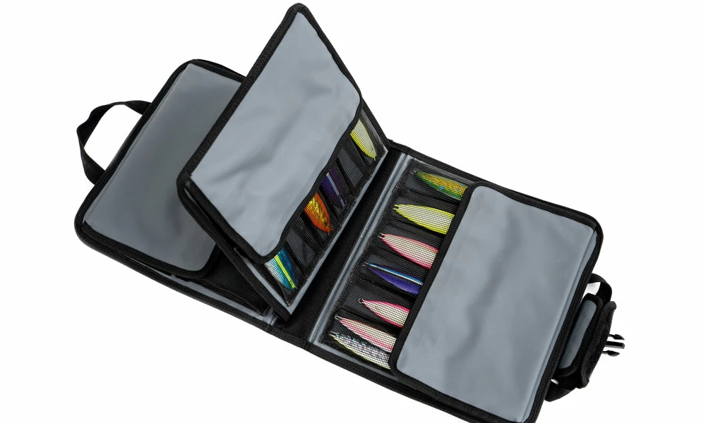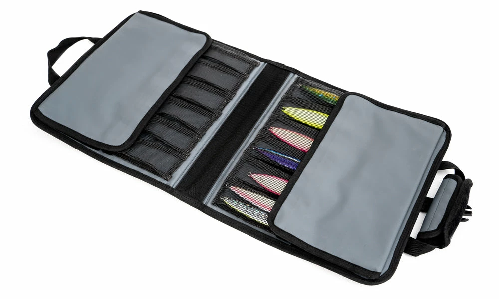 Neatly store a minimum of 24 large jigs in the Wallet, or by adding the Velcro insert Sleeve it doubles your storage capacity to 48+ large jigs. The Sleeve can be used separately as a handy jig or lure storage unit and with its strong waterproof material and Velcro cover its ready to hold your jigs safe a secure. This jig storage system is built strong for the toughest conditions.