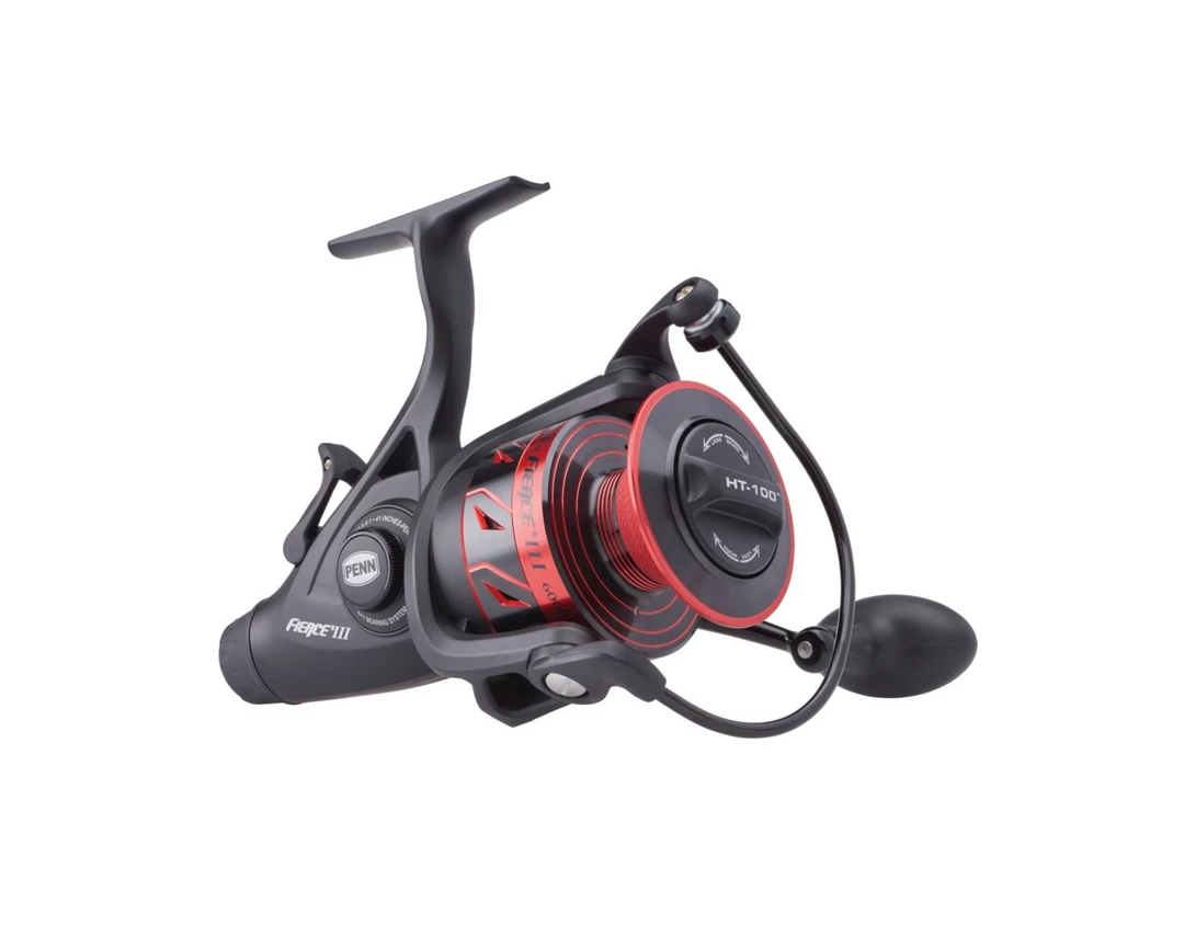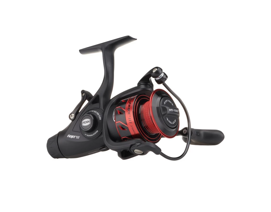The PENN® Fierce® III spinning reels are available in a range of sizes, from 2500 to 8000. Featuring a full metal body and sideplate, along with PENN HT-100™ carbon fiber drag washers, the Fierce III can handle anything inshore or nearshore. A 4+1 shielded stainless steel ball bearing system ensures smooth retrieves while the heavy-duty aluminum bail wire and superline spool allow for easy line management. The innovative Live Liner drag system is adjustable and automatically disengages with a turn of the handle, making it ideal for bait fishing.
