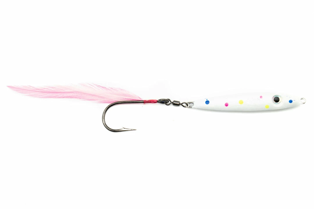 The S&S Slim Fish is a great casting jig for multiple species. When stripers are on sandeels, these are an excellent choice. False albacore and bonito also seem to be very fond of the smaller sizes. These jigs cast very well, and look great in the water with their feathered tail hooks.