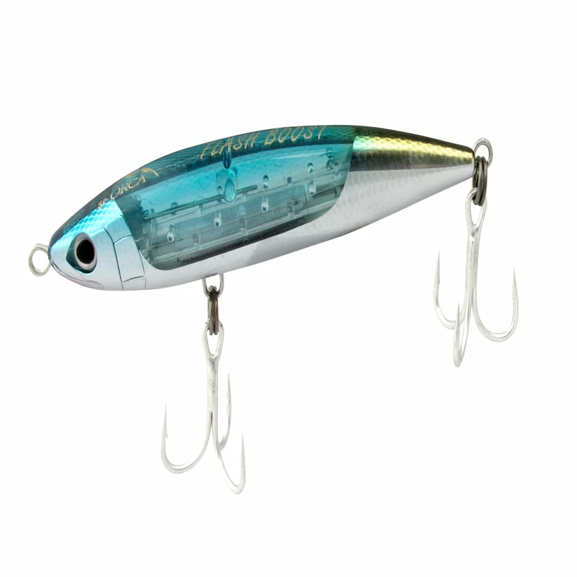 The SP-Orca FB comes equipped with Shimano’s revolutionary Flash Boost technology. The Flash Boost technology suspends foil on small springs inside of the lures body. This allows the lure to constantly emit an attractive flash, even on the pause. The placement and movement of the foil is also designed to mimic the movements of an injured baitfish. This lure comes equipped with 3X hooks and split rings, through wire construction, and Shimano’s Propulsion Weight Transfer system for increased casting distance.