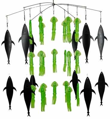 Squidnation has joined teams with Marlin Mudflaps to bring you the Blackflap Dredge. This dredge was inspired by the incredible success of both Squidnation Dredges and Marlin Mudflap Dredges in place like the Domican Republic, Costa Rica and the Bahamas. The action of the squids on the inside represent a ball of squids trying to defend themselves and the Mudflap tunas represent a pod of small tunas attacking the squid. This happens every single minute of every single day in our oceans. But now it can happen behind your boat. Nothing generates a strike from a top predator then smaller predators feeding. Create what works in nature and get more bites! Constructed of 7 chains of 9 inch Squidnation Squids and 6 13 inch Mudflap Marlin Tunas and a 36 inch stainless steel Strike Point Dredge Bar. Pick your favorite color squids and get ready for a strike!