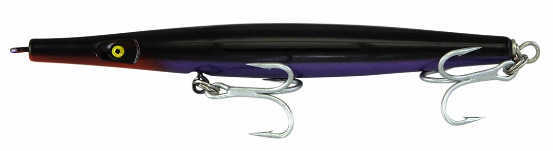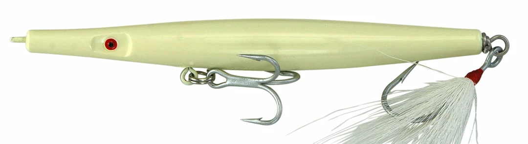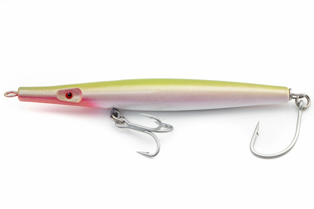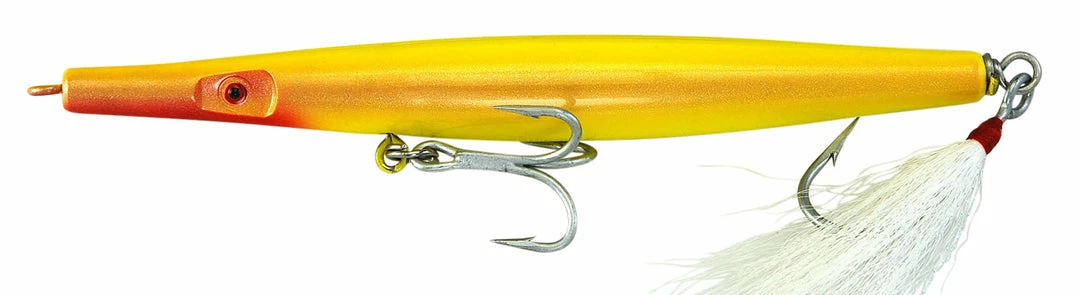 The first version of this lure became popular on Cape Cod during the early 80’s. This sinking needlefish lure slips through the wind for very long casts. It is a legendary lure for catching cow bass when sandeels and other thin baits are present.Â
