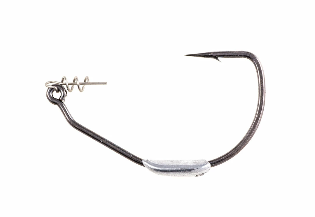 Beast Hooks with TwistLOCK® Centering-Pin Spring (CPS) are designed for weedless-style rigging of larger plastics like big swimbaits, flukes, tubes and creature baits. With its TwistLOCK® Centering-Pin Spring (CPS – patent pending) attached to the hook eye, baits can be permanently secured by inserting the pin in the center of the nose of a soft plastic, which can then be screwed onto the TwistLOCK® coil spring to rig perfect everytime! Different Size springs are matched to hook size to maximize holding power. Quick-drop shank below eye allows for rigging fat-headed baits, and maximum gap allows for improved hook sets because of better bait clearance. The non-movable weight attached (5130W) not only helps to sink or swim a rigged bait down into the strike zone, but because the weight is positioned so low on the shank, it provides a keel effect. As a result, when rigging large swimbaits weedless-style, plastics swim naturally (as opposed to rolling or flipping where weights are inserted inside soft baits). Ideal for both fresh and saltwater fishing, features include a TwistLOCK® Centering-Pin Spring (CPS – patent pending) attached to the hook eye, maximum gap, a XXX-strong forged shank, Super Needle Point, and black chrome finish.