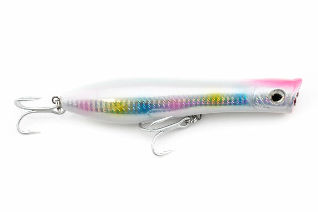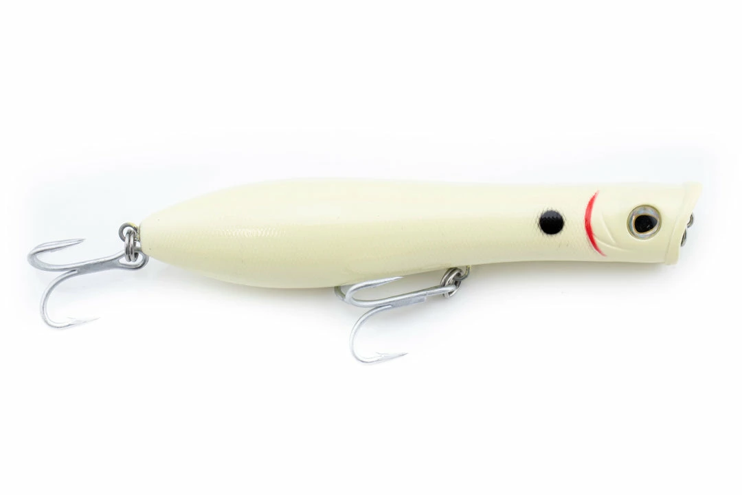 This floating top water lure delivers a popping, splashing, skittering action to draw reaction strikes from predators. This is a dual purpose popper that can be fished as either a traditional popper, or a pencil popper. Large weight transfer balls provide longer tumble-free casts and loud. fish attracting rattles. Tough colorful finishes with life like 3D eyes imitate prey species. Extra sharp VMC® Cut Point® treble hooks assure faster hook-sets. Heavy duty stainless steel split rings and rattles are part of the superior contruction that guarantees more dynamic fishing.