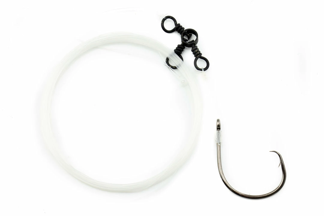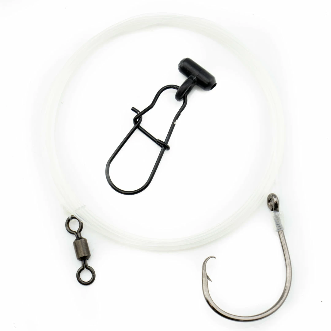 To suit your preference, our live bait striper rig features the option for either a 3-Way Swivel, or “fishfinder” slide method for sinker attachment. The 3-way rig has a light monofilament loop to attach your sinker, and the fishfinder sinker slide you would thread your main line through before tying it to the swivel. The leader is 6 feet long on this rig, with the option for an “octopus” J-Hook, or a circle hook. Whether you’re drifting the rips of the inlets, or the famed waters of Montauk Point, this is our top rig of choice. This rig can also be used for live bait fishing in channels for big redfish.