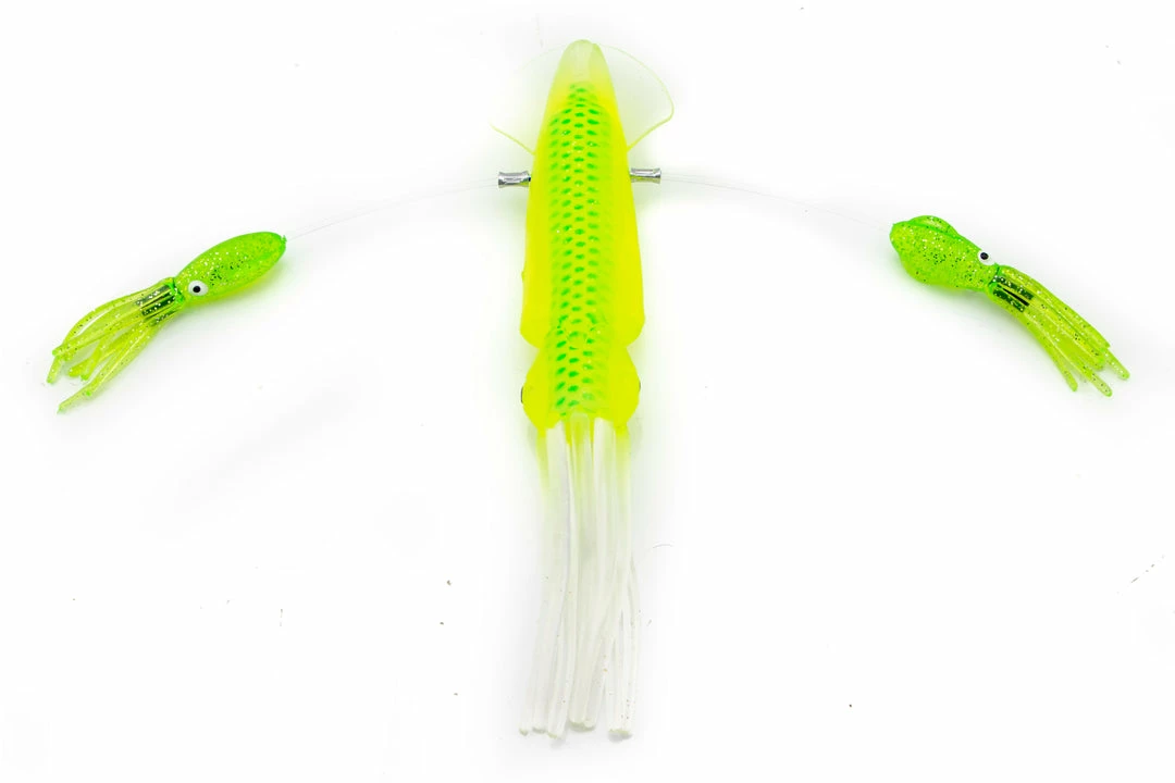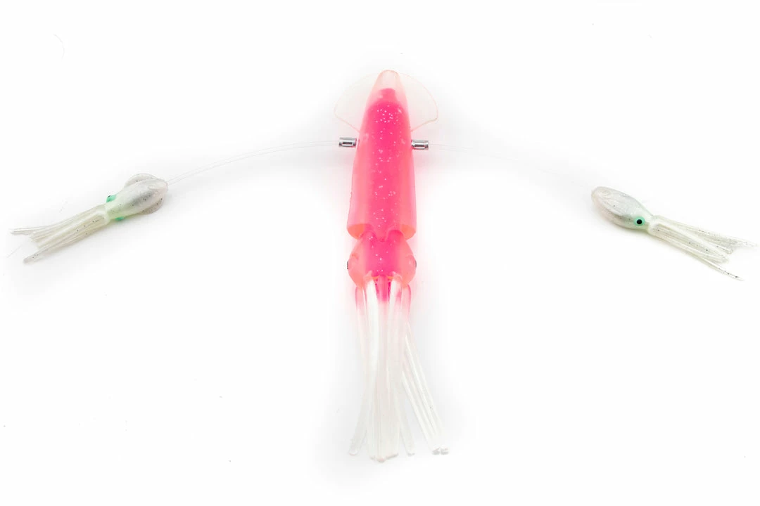 Our custom rigging is the best in the business. This daisy chain teaser is built using junior floppy squids. This is an excellent chain for Northeast tuna fishing. The ball bearing snap swivel at the end allows you to attach any lure of your choice. For tuna, we recommend adding a hook bait with a 5 foot leader. For billfish, a hookless teaser with a 2-3 foot leader is perfect.