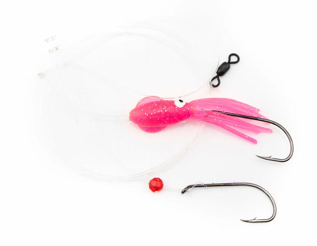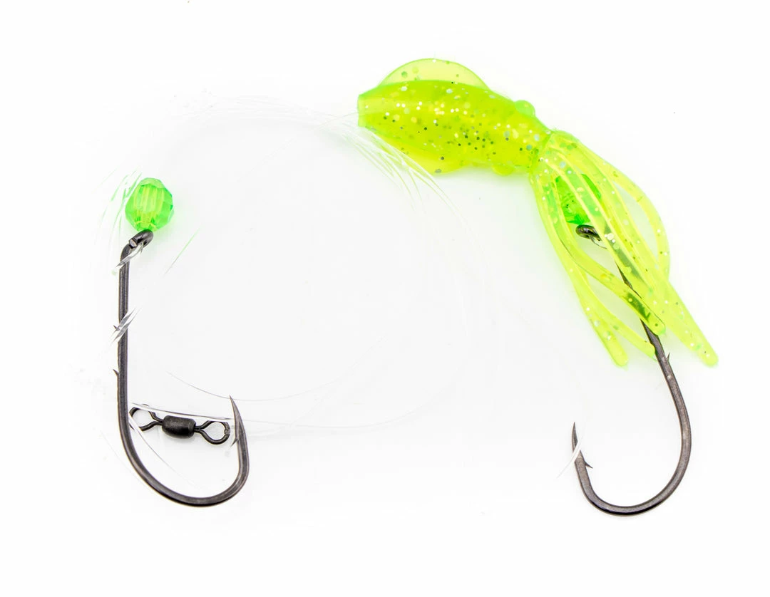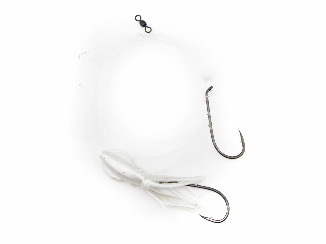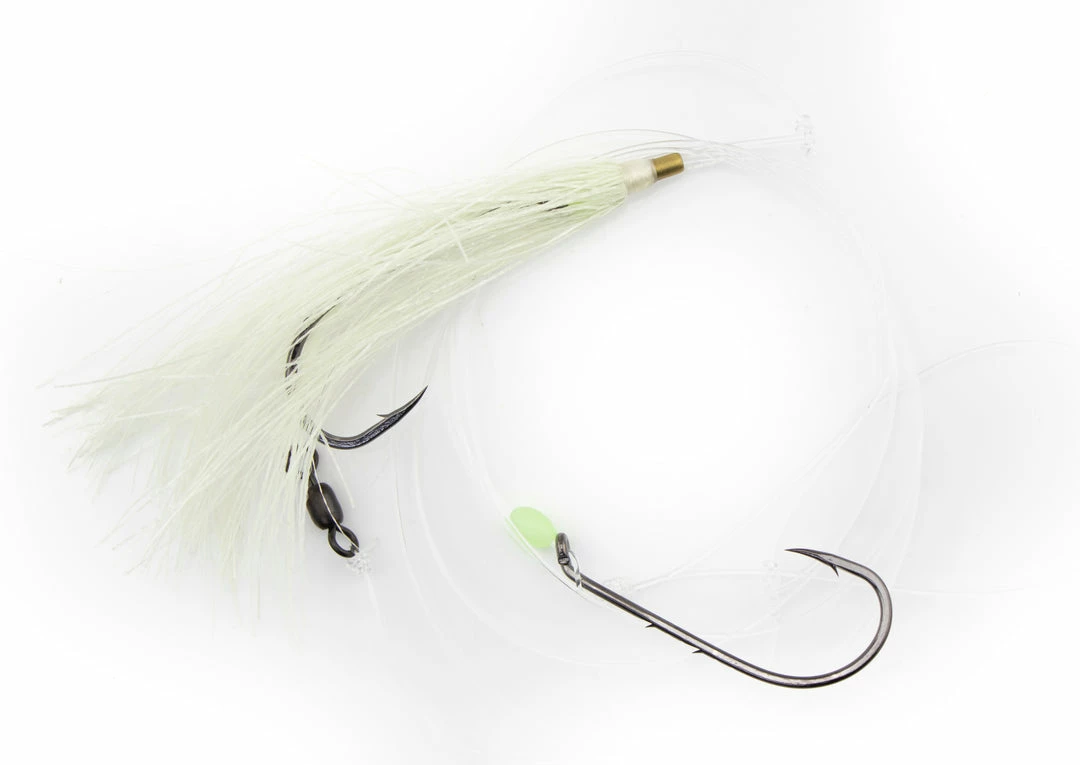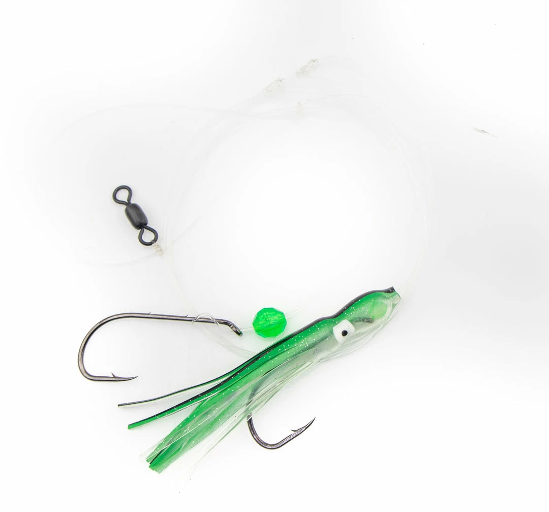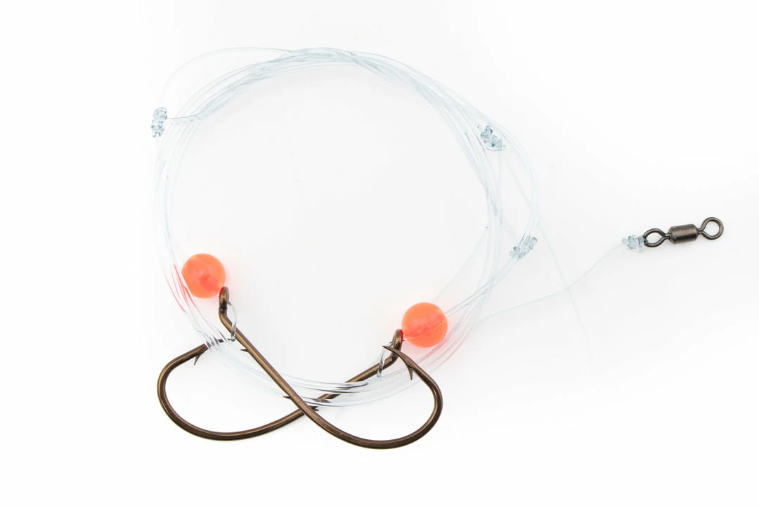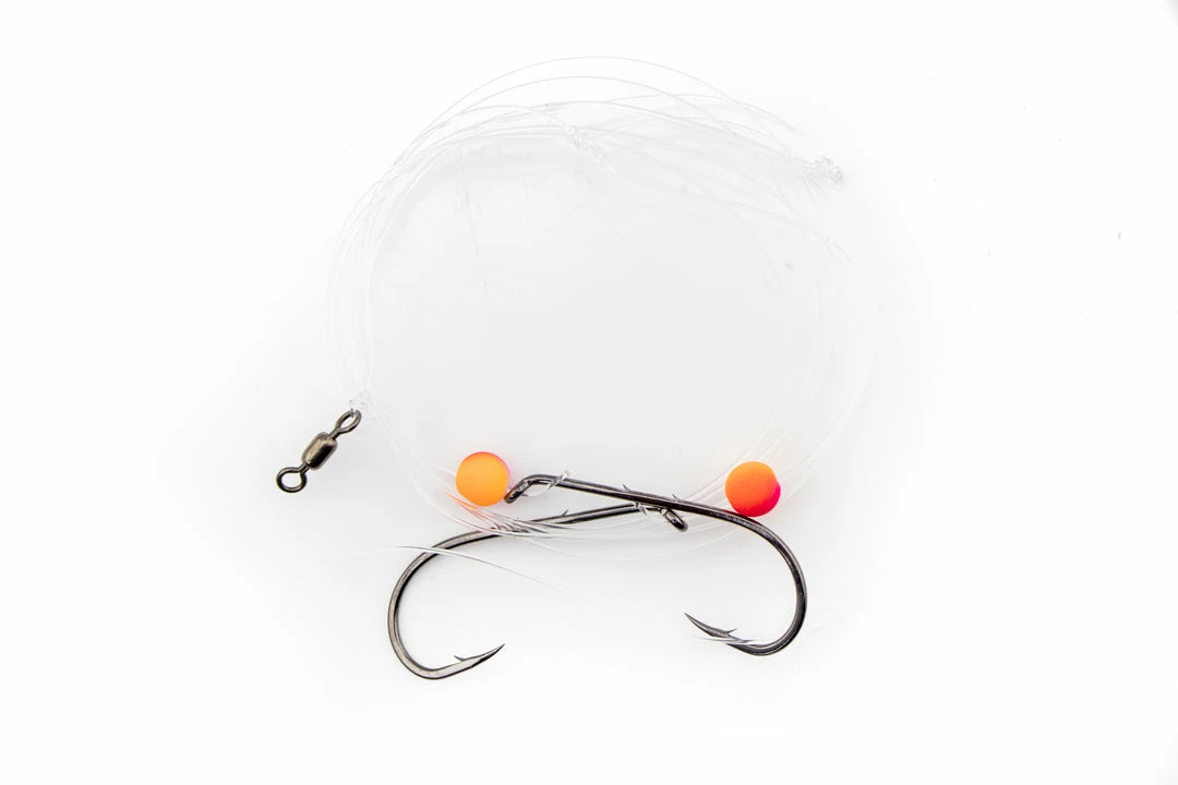 Nobody beats the quality of our custom rigs, hand tied right here by professional fishermen, with the right configuration to catch your target species. These Hi-Lo “chicken rigs” are meant for sea bass, porgies, cod, and many other bottom fishing species. These rigs have a sinker loop at the bottom, one low hook, and one high hook, with a swivel at the top. We offer these with various bead/teaser configurations. Fish these rigs with clams, sandworms, or squid.